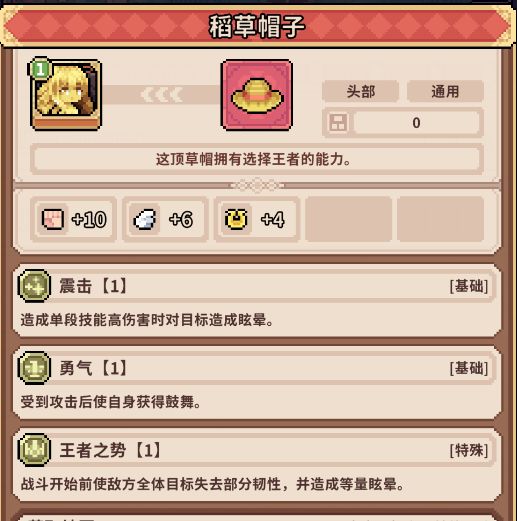草帽是新生平原的红色品质装备,其特殊效果“王者之势”可以在战斗开始时使敌方全部目标失去50%韧性并造成等量层数眩晕,能使不免疫眩晕的敌人无法行动两回合,提供宝贵的输出时间,是99%成型阵容必备的神器,有了它,阵容强度将得到巨大提升。