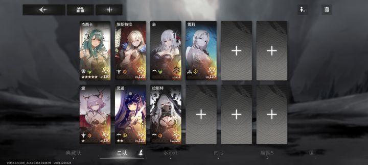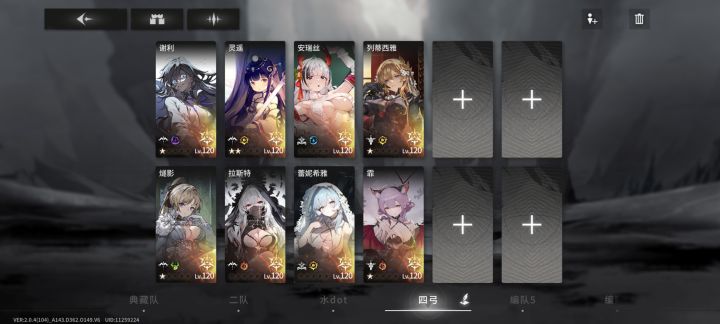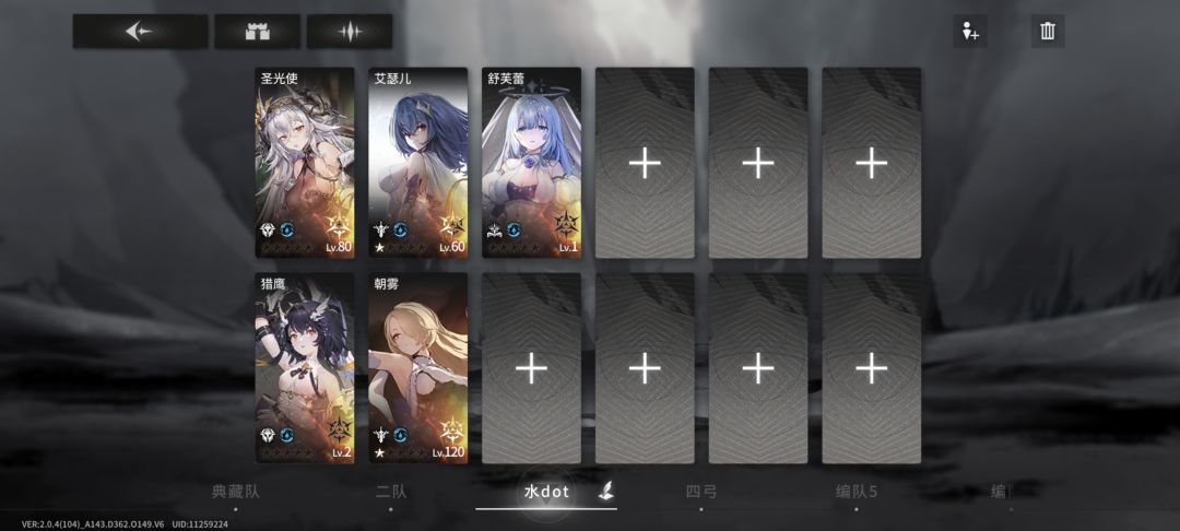 四队水队,传统水dot是没出路了,朝雾要三星才有dot效果,渡鸦没有dot。空法位是阿斯特莉亚(水拐,我还没有),然后弓位是俩水弓。水队我感觉还可以再稳稳,什么时候出一个舒芙蕾的上位成员拉动一下艾薇儿输出,什么时候才具备培养的优先级。