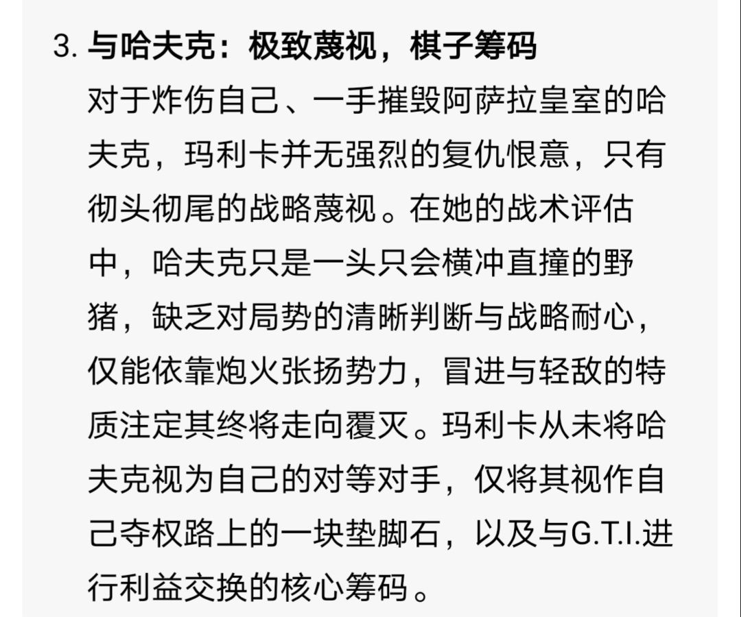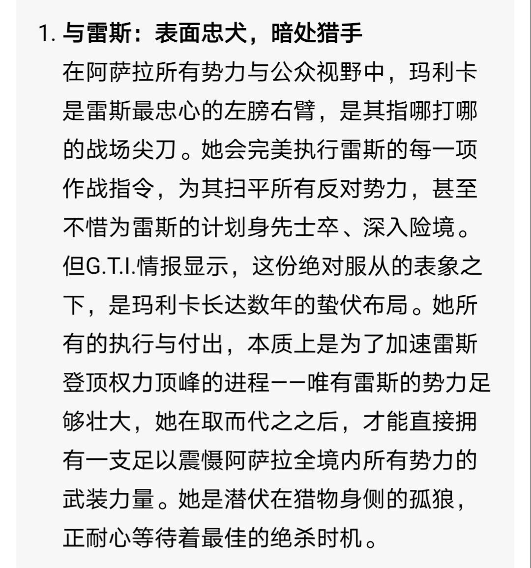 玛利卡·扎伊德,代号「头狼」,工程定位特战干员。53岁,阿萨拉籍,前阿萨拉皇室核心秘书,亲历王权兴衰,皇室驻地轰炸事件后转型为铁血战士,现任雷斯专属雇佣兵首将。她以忠诚为伪装蛰伏布局,借雷斯势力积蓄力量,信奉“唯有握在手中的力量,才是乱世生存的唯一法则”,终极目标是夺权掌控阿萨拉。