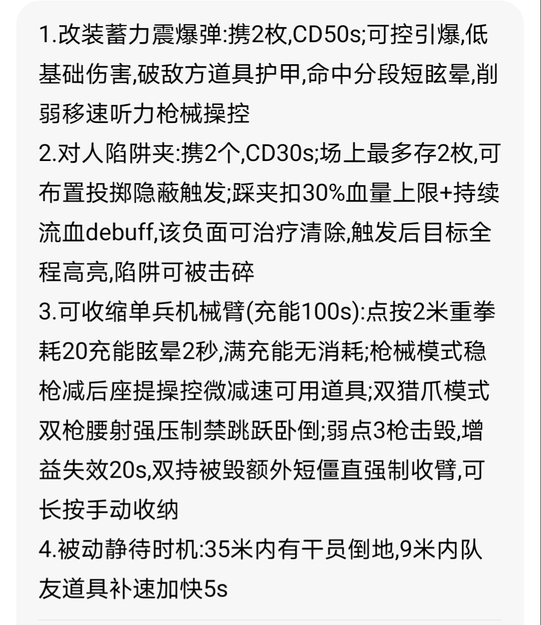 3. 核心装备·可收缩单兵机械臂:基础充能100s,可释放2米范围眩晕重拳、开启枪械稳控模式(降低移动速度)、双枪腰射强压制,双持状态下无法跳跃、趴下;3枪即可击毁,损毁后增益失效20s,双持状态被毁额外僵直,可手动长按收纳。