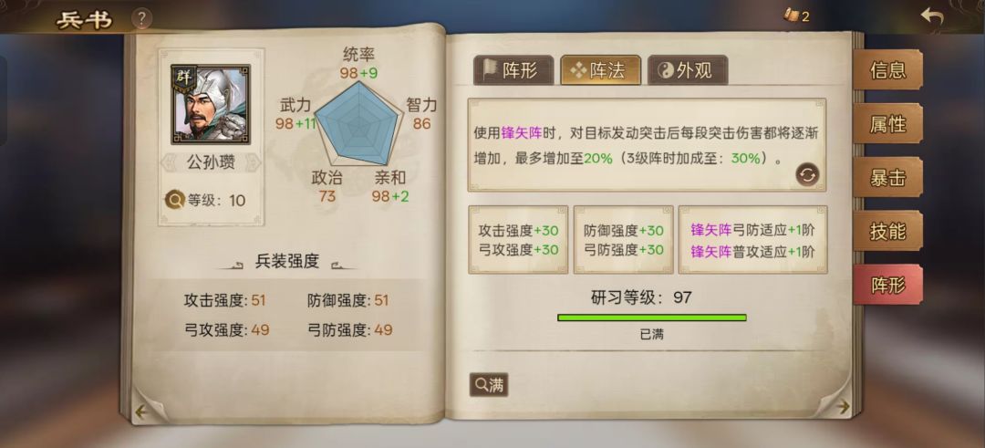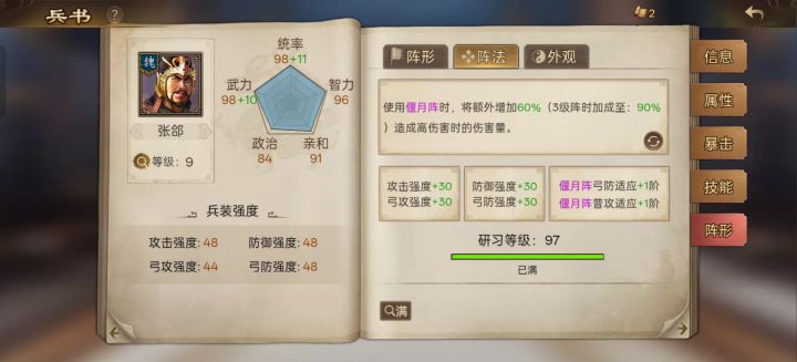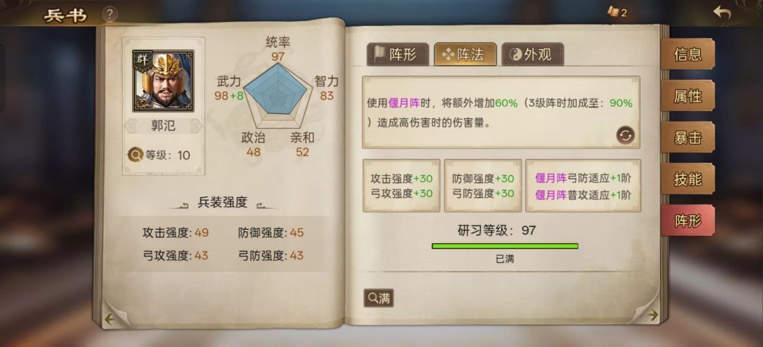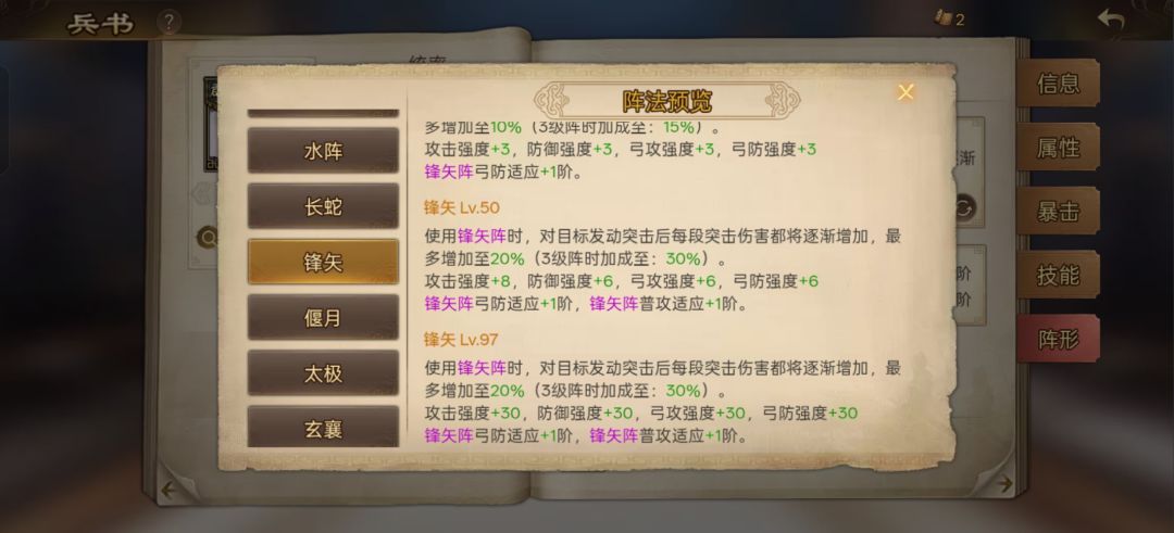 剩下的阵法研习的图:我就不标注了,满级的偃月阵弓防适应和普攻适应显示还是+1,预览里描述是叠加的还是叠加后显示隐藏了呢?不应该显示是弓防适应+3和普攻适应+2吗?不光偃月阵,锋矢也是,雁形也是。具体游戏里有没有变化不知道,就是看着怪………