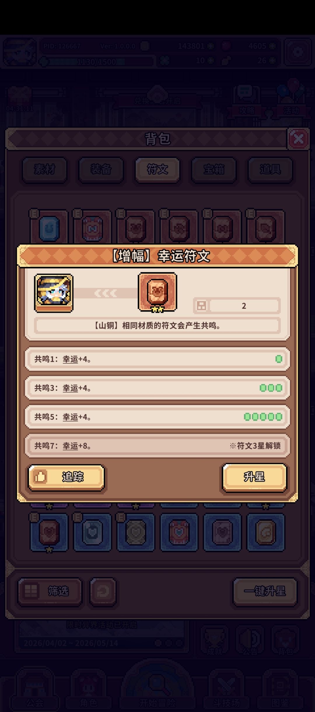 符文目前是优先级最低的一个了,但也会给一些细节提升,比如我自己的队伍在微调冰蜂和水晶菇的速度和攻击力就用符文进行调配,符文升星和装备升星的模式是一致的,所以星级也会比较慢,但影响不大。符文共鸣是单一角色,同一体系的符文装配的数量,数量到达要求可以激活多个共鸣词条(p4)。切记一点!!!不要用四叶草刻意刷符文,符文并没有装备的未拥有优先级,纯随机!!!