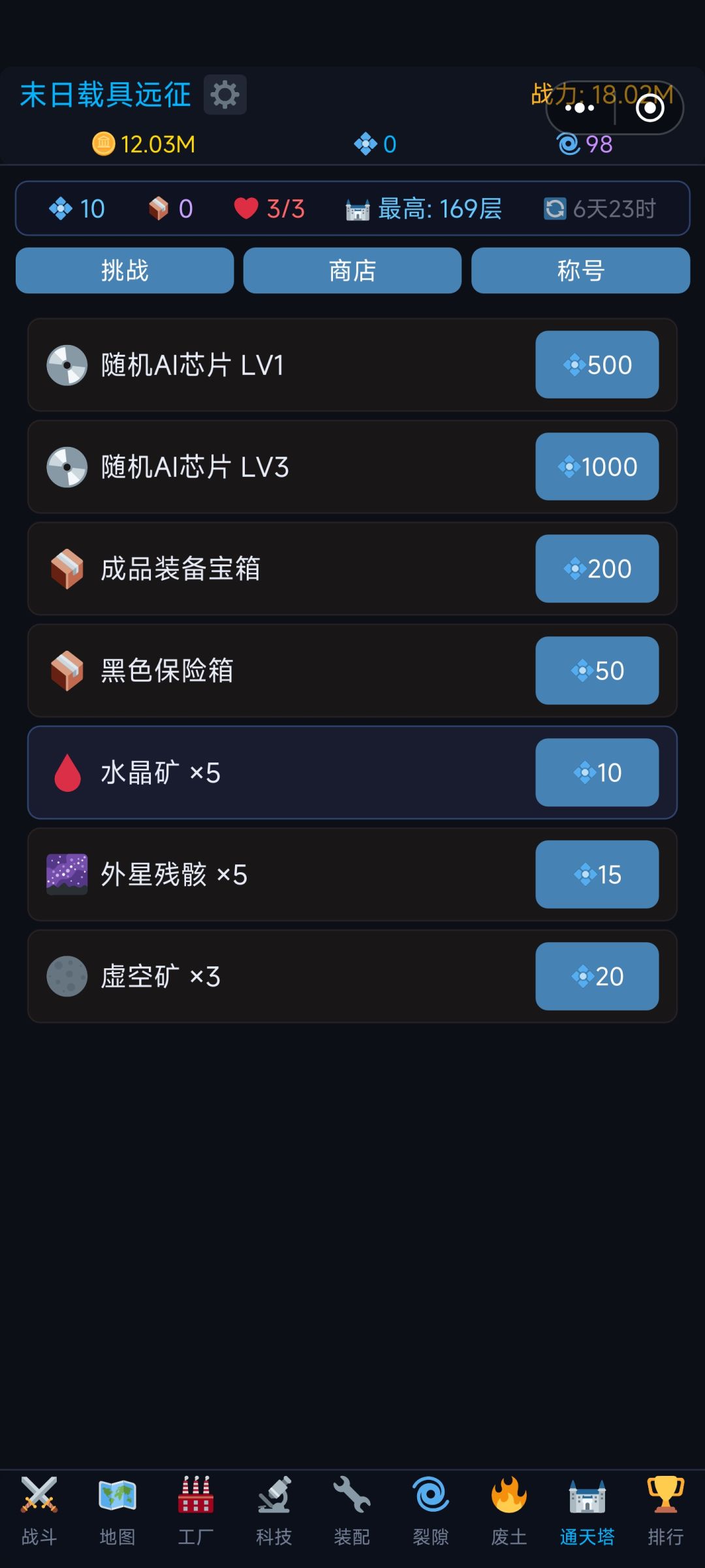游戏帮你们试完了,新来的玩家注意,这个游戏需要看很多广告,然后爬塔170都不够给的能量碎片不够你换一个一级芯片的,然后芯片是后期最重要的的东西。如果你没有芯片那么你将可能推不动图。当你肝到T6就会打不动了,然后这个游戏需要全程在线挂机,如果不挂机的也不建议玩了,因为你资源的。