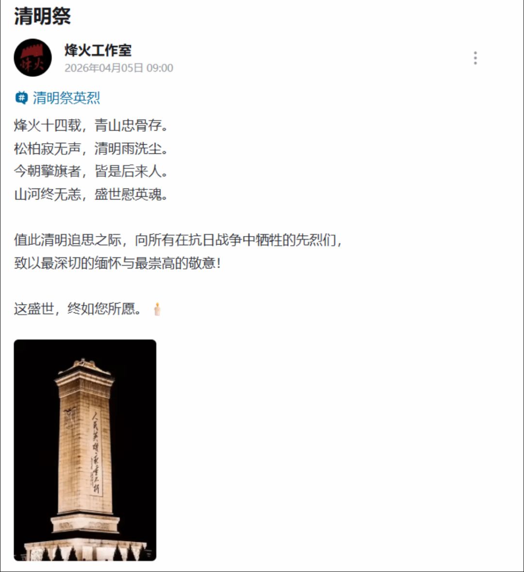 由烽火工作室发布祭文与五言诗,深情缅怀抗战英烈,致敬革命先烈。