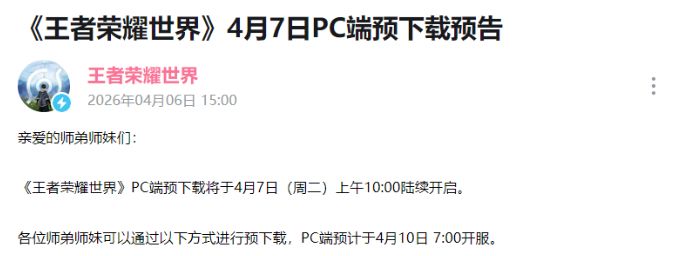 《王者荣耀:世界》官方今日正式发布预下载预告,PC 端将于4月7日上午10点开放预载,玩家可提前做好准备,迎接这款开放世界新作,游戏预计4月10日7点开服。