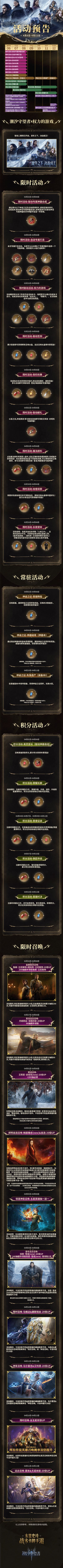 「权力的游戏」联动版本现已开启丨联动活动、联动签到、自选联动专属神器打造、专属神器合成等活动限时开启!寒途召唤-艾莉亚·史塔克(new)-20倍UP+200抽必得!烬明自选召唤-梅丽珊卓(new)&自选-20倍UP!凛冬远古召唤-琼恩·雪诺(new)-20倍UP,160抽额外领取琼恩·雪诺(new) 限领取1次!神圣召唤-马尔里克&艾利恩-20倍UP!远古召唤-黛米&尤诺米娅-20倍UP!