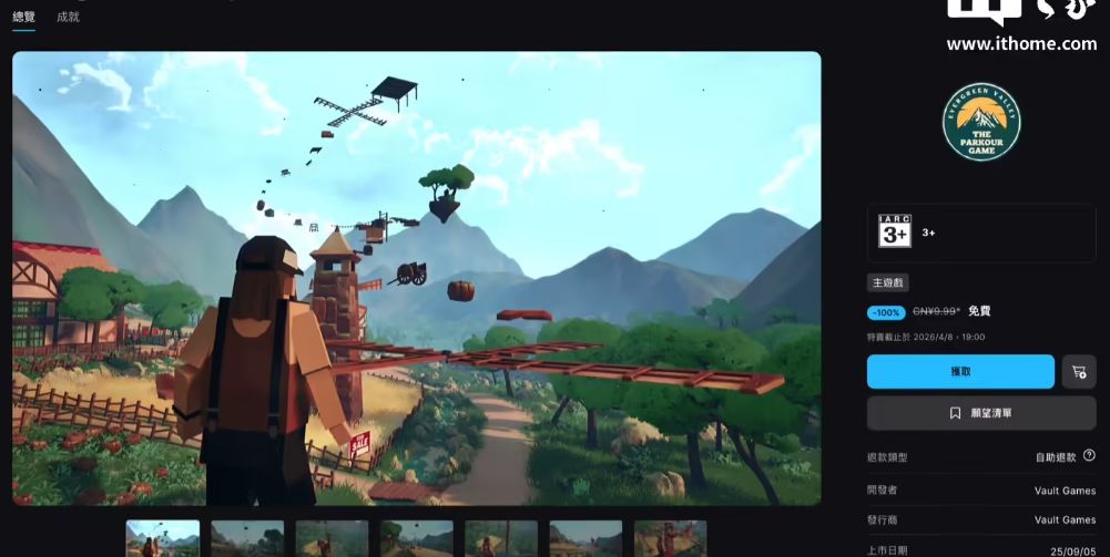 Epic Games Store近期迎来惊喜“喜加一”,由Vault Games开发的登高跑酷游戏《Evergreen Valley: The Parkour Game》开启限时免费领取活动,玩家可在4月8日18:00前免费入手这款原价9.99元的作品,领取后永久入库。