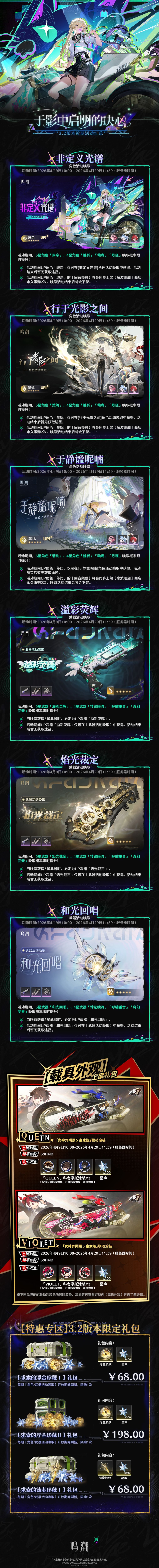 本次汇总覆盖3.2版本全周期核心活动,兼顾战斗、养成、休闲与剧情体验,覆盖不同偏好玩家需求。核心内容包括:角色与武器唤取轮换、材料双倍养成福利、趣味休闲玩法、高难挑战与七日签到等,奖励囊括星声、共鸣促剂、限定印章、摩托涂装等珍贵道具,助力漂泊者快速提升战力、丰富收集内容。