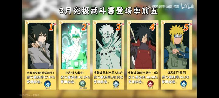 另外决斗场佐助登场率冲上第一,46.2%胜率 。 3月究极武斗赛登场率前五也公布了 宇智波佐助47.47%、巳月49.07% 、宇智波带土58.83%、、宇智波斑48.08%、波风水门46.3%