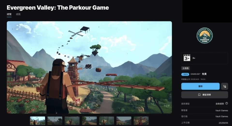 4月6日消息,Vault Games开发的3D登高跑酷游戏《Evergreen Valley:The Parkour Game》(常青谷:跑酷游戏),已在Epic Games Store国区开启限时免费“喜加一”,原价9.99元,玩家可在4月8日18:00前免费领取并永久入库。