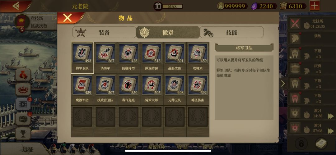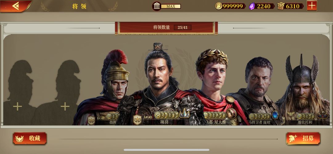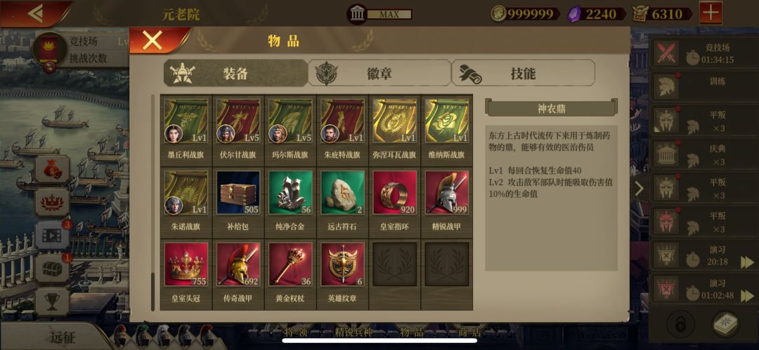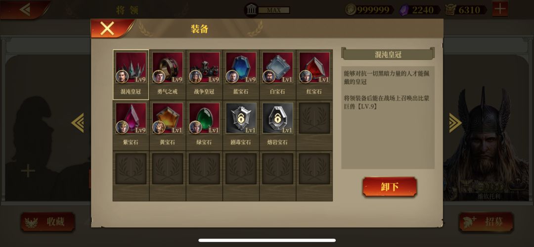 第三是加冕可用的皇冠和戒指,也可以用于兵种升级。主要用的兵种也都升满了,能加冕的项羽和屋大维,庞培也加冕完了,到这就没处用了。