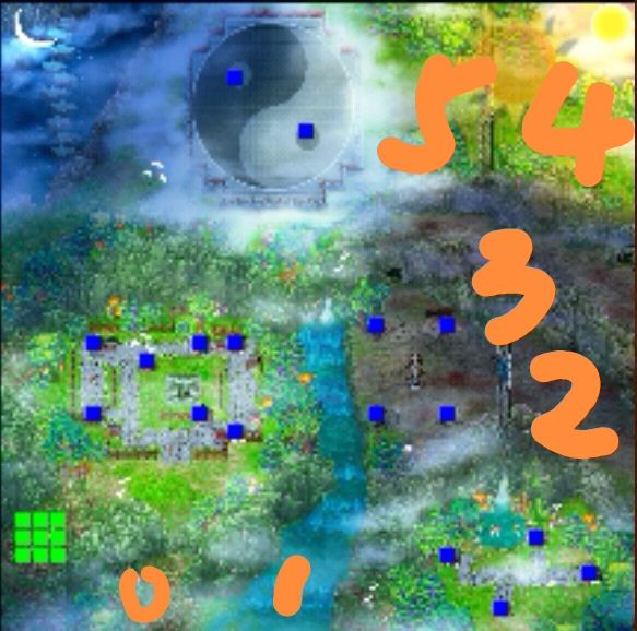 全员放在图9圆圈处,避免被雷震子伏兵打到。马超去图9“1”处引出雷震子。打完雷震子伏兵后,全员往右挪动,马超去右边打四神。