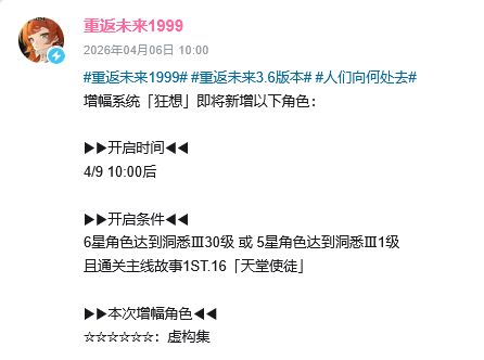 官方宣布,增幅系统 狂想 将于4月9日上午十点后新增虚构集等角色的强化。