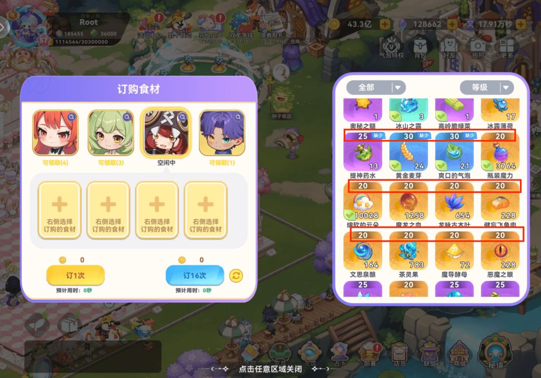 4、基础产量的提升在主角天赋订货员界面的5至8项,点满后所有食材都可以+5的基础产量,考虑到高级食材原本的基础产量只有15,增加5产量变为20后,对于整体订货数量的提升十分显著。