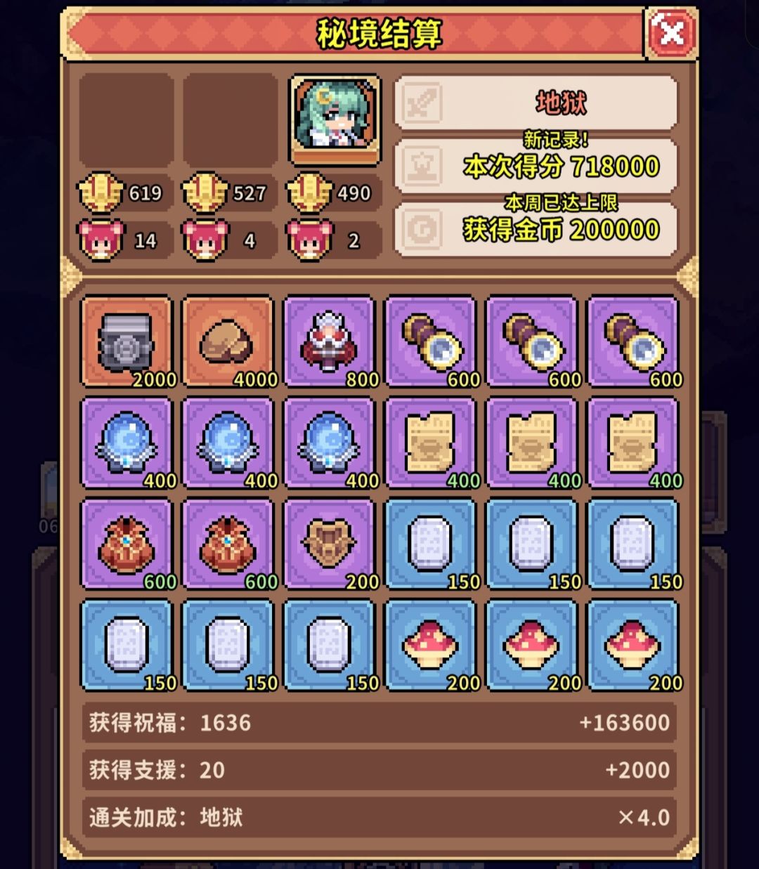 如果是简单难度,结算时则乘以1.5倍的难度系数分,也就是57600×1.5=86400得分,打完给8.6w金币,想一把拿满就需要1300+总祝福等级。
