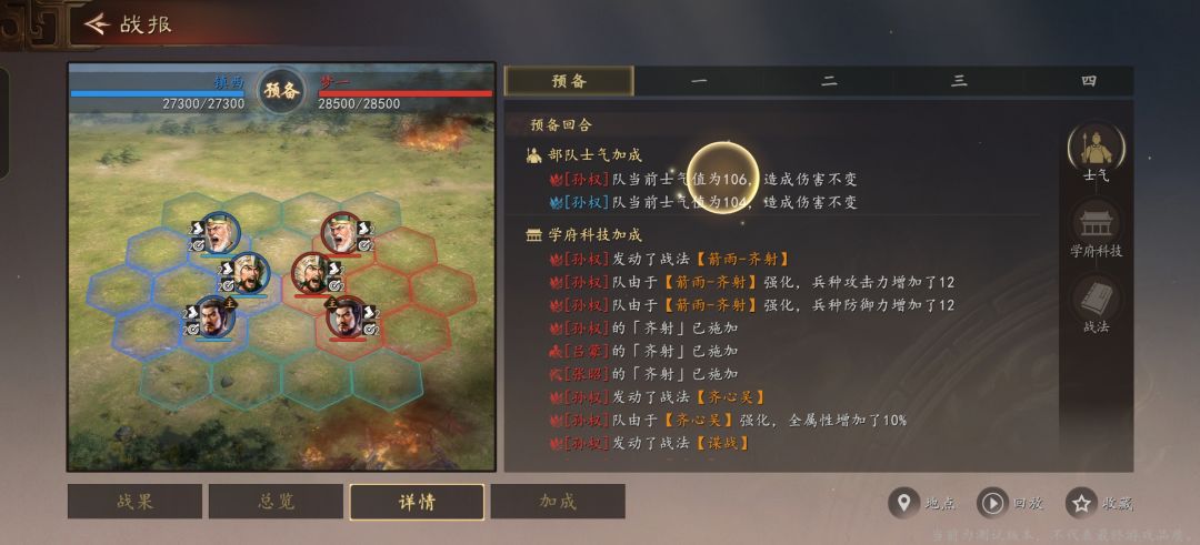 因此我们常带擂鼓与合军对友军解控类战法提高孙权的输出环境同时带锋矢阵来提高孙权输出强度