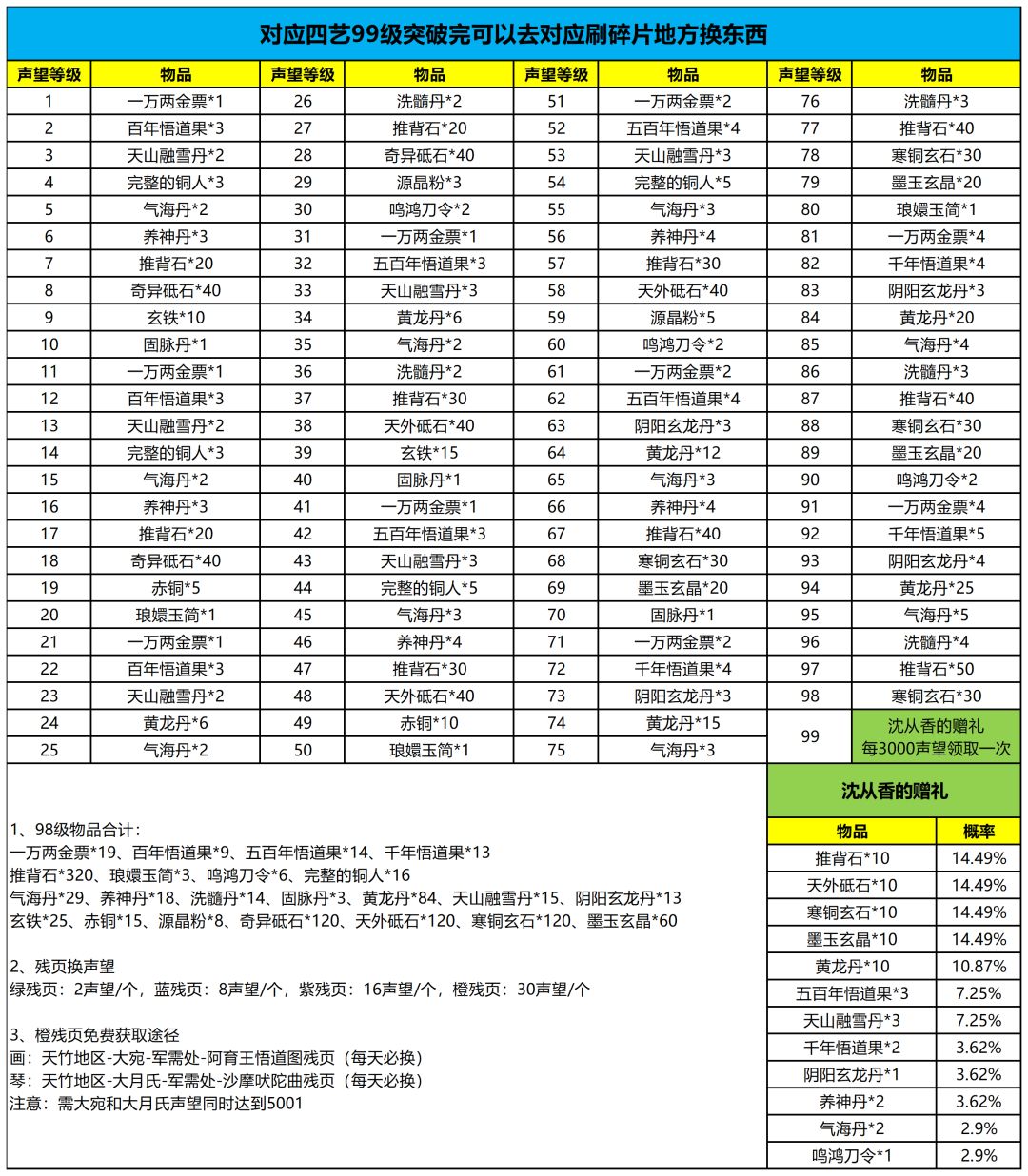 注:其他四艺的东西也都一样,不过得对应四艺突破99级才能赠和兑换