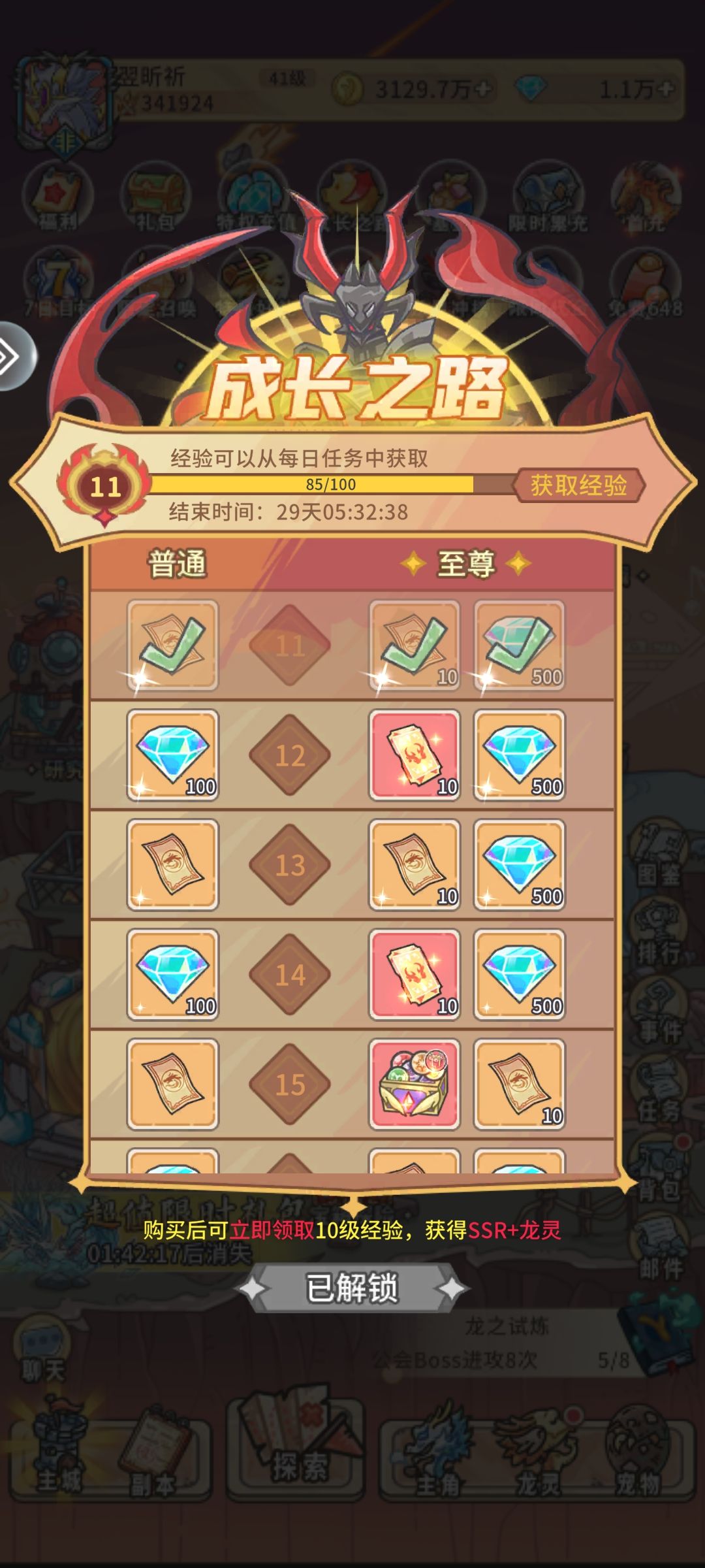 接着把爬塔的那个基金买了,以及旁边的成长之路,这两个开局能给总计5个左右的SSR,运气好拿到好用的后直接就能平推pve和PVP了。