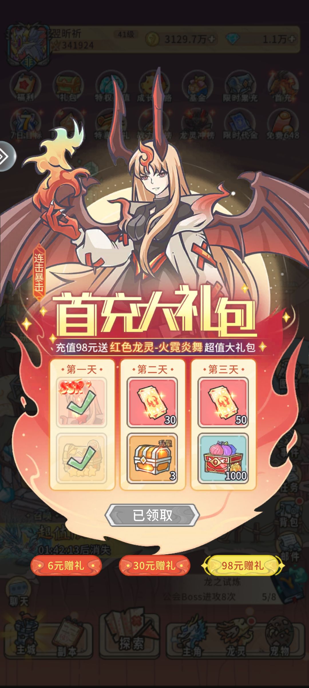 接着一直推主线,推到你能爬塔为止,然后爬塔到40星(将火系那个人形龙升级就能过,大概十层左右的样子),然后买个6块328代金卷。