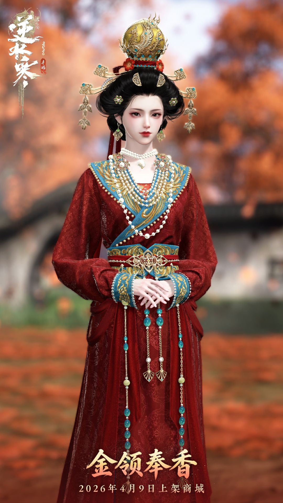 4月9日(星期四),全新时装【金领奉香】上架商城,售价680纹玉,4月9日8点后-5月29日0点限时折扣60纹玉,支持使用半价券、代金券以及限定纹玉。