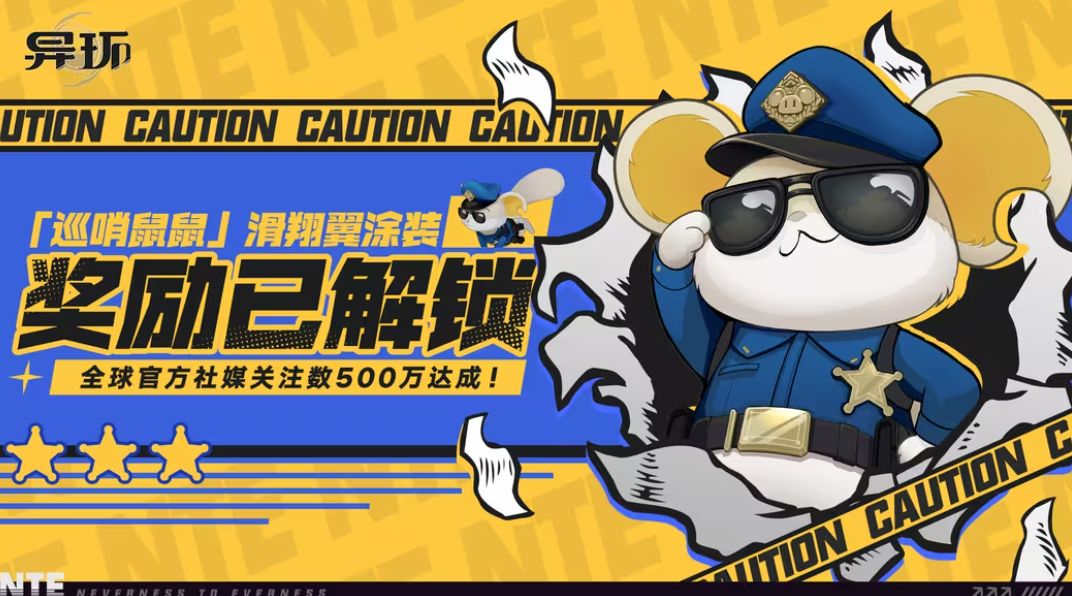 都市开放世界RPG《异环》热度持续飙升,官方今日宣布,游戏全球社媒关注总量已突破500万大关,并成功解锁对应里程碑奖励 —— 限定滑翔翼涂装「巡哨鼠鼠」微博。该奖励将在4月23日 游戏全球公测开启后,统一发放至所有玩家账户。