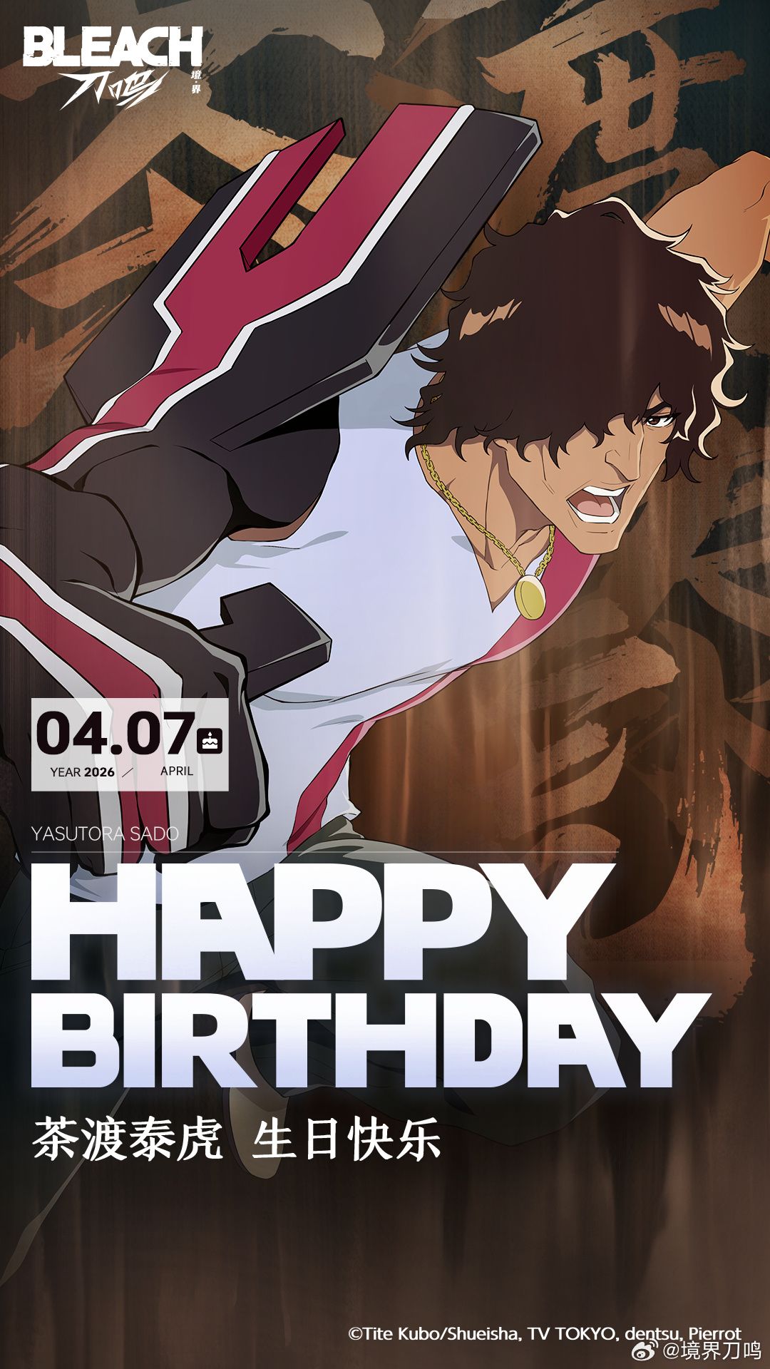 今日,正版授权手游《境·界 刀鸣》官方发布重磅庆生贺图,热烈庆祝游戏与IP中极具力量感的核心角色——茶渡泰虎的生日。