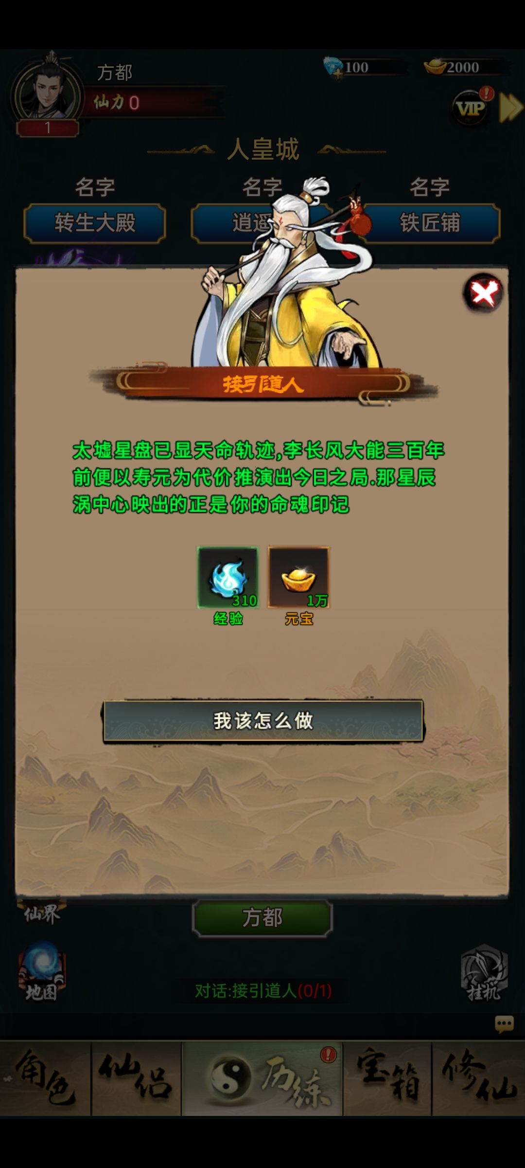 逍遥道人让你去炎黄大陆历练。这是游戏的根基,也就是 “历练修炼” 系统。