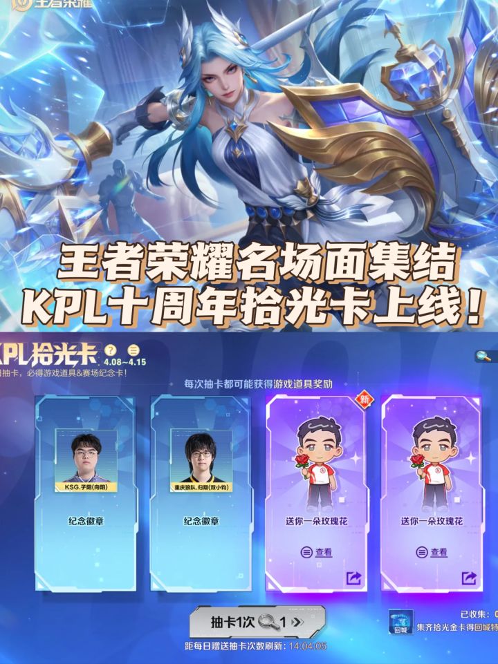 宝子们看过来!4月8日王者荣耀KPL拾光卡活动来啦🥳 作为KPL十周年纪念活动,全程免费、福利拉满,新手也能轻松参与,快一起冲~#今天游戏圈发生了啥 #王者荣耀