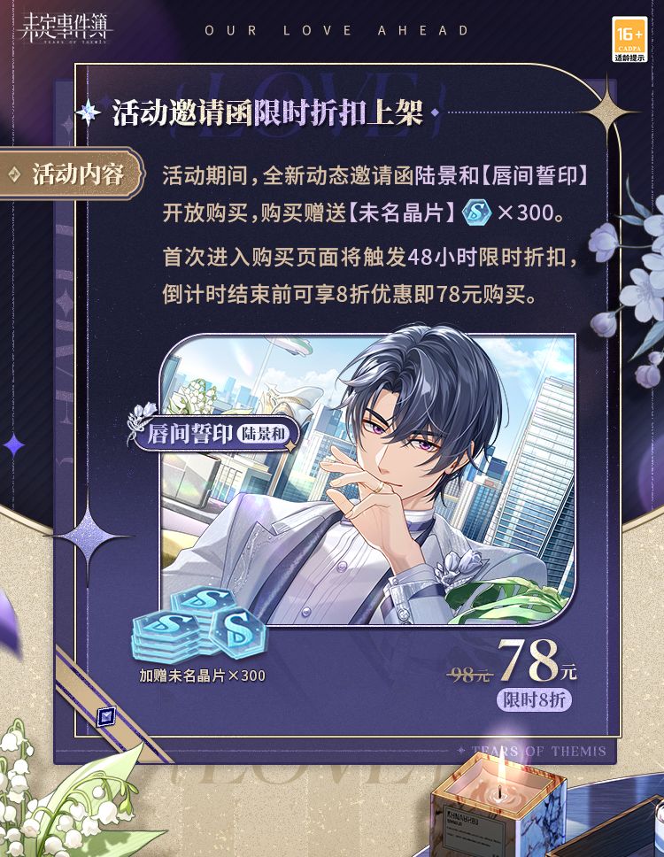 活动期间,律师可通过「爱有所期·陆景和篇」活动界面购买活动主题邀请函:陆景和【唇间誓印】。邀请函售价98元,当律师进入购买界面时将开启48小时限时折扣,倒计时结束前可享受8折即78元购买。同时,购买活动邀请函附赠【未名晶片】×300