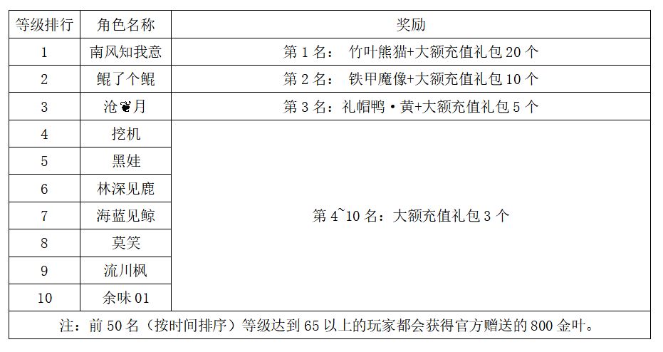 注:以上活动排名均以服务器时间为准。新区排行榜活动如发现存在违反游戏相关规定使用游戏外的辅助工具进行作弊将取消获奖资格。