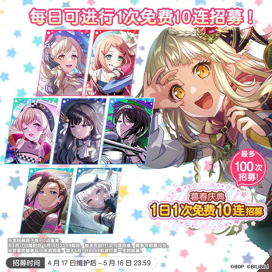 为庆祝暮春庆典活动的开启,4月17日维护后,游戏内将开启每日次数更新的免费10连招募——「暮春庆典1日1次免费10连招募」!活动期间,每天可参与1次免费10连招募,最多可参与10日,累计可进行100连免费招募,还请不要错过~