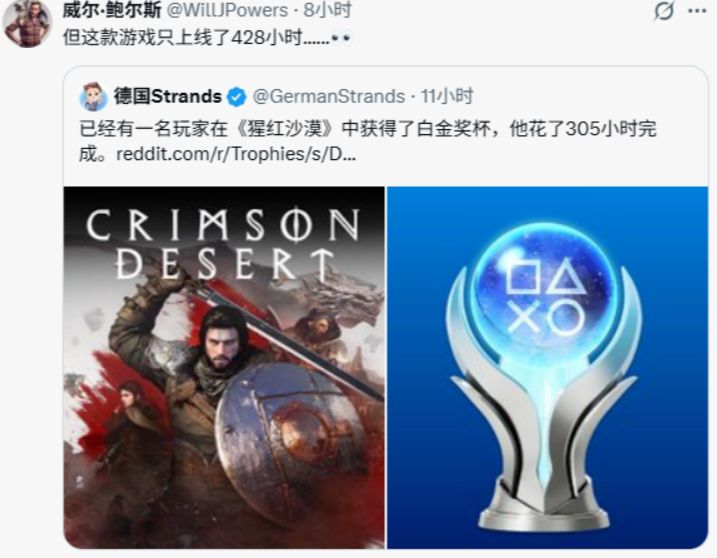 《红色沙漠》发售仅18天,Reddit就有玩家晒出PS5白金截图,并表示自己耗时用了将近305小时才达成这个硬核成就,该事迹瞬间引爆社区,网友纷纷致敬这位“肝帝”。