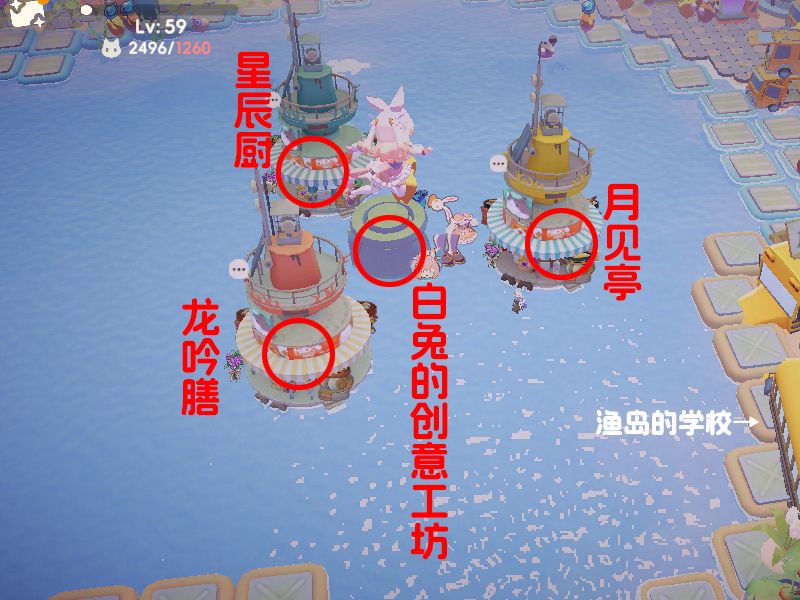 以及围绕白兔雕像的3个建筑,分别是龙吟膳(中餐商店)、月见亭(日料商店)、星辰厨(西餐商店)