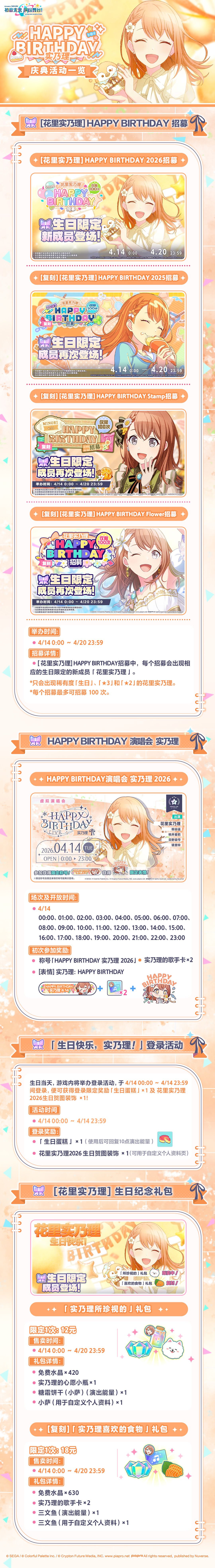 「HAPPY BIRTHDAY 实乃理」庆典活动将于后天(4月14日)正式开启!敬请查看相关活动一览。