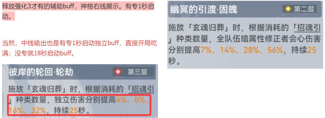 b.施放强化3技能时,根据消耗的「招魂引」种类数量,全队伍暗属性修正者会心伤害分别提高7%、14%、28%、56%,持续25s。