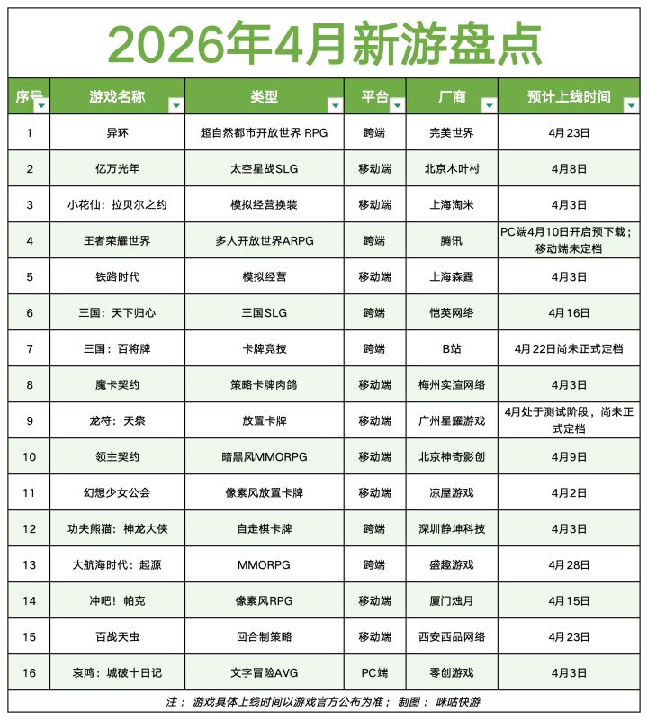 4月预计有16款新游戏上线,涵盖卡牌、开放世界、模拟经营、文字冒险等多个品类。