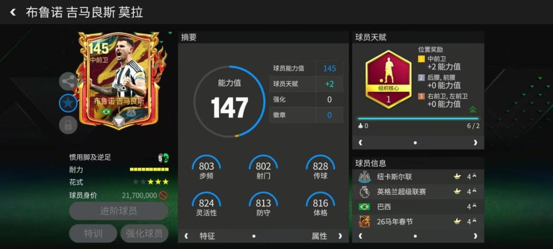兄弟们,全新的26马年春节活动上线啦!桑巴军团巴西,作为足坛顶级国家队,其国脚通常在欧洲豪门担当关键主力。本次26马年春节活动中,有着三位来自巴西的全新球员卡,F宝就带大家来看看这三人的实力如何吧~吉马良斯(中前卫)布鲁诺·吉马良斯,1997年生,巴西/西班牙双国籍,纽卡39号中场 。2022年加盟纽卡,攻防全能、出球顶级、覆盖极强 。巴西国脚,2021奥运金牌、2022世界杯主力,2025助纽卡夺联赛杯冠军。