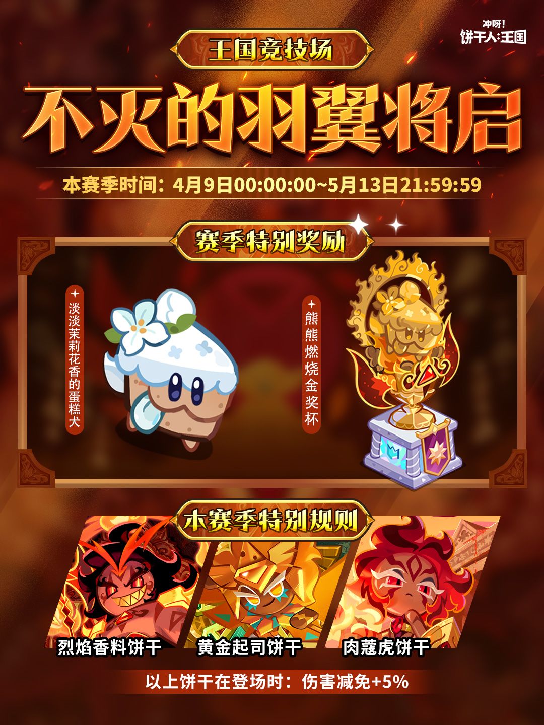 在此之后,全新竞技场「不灭的羽翼赛季」也将开放,参与挑战,有机会获得赛季特别奖励淡淡茉莉花香的蛋糕犬、赛季专属装饰熊熊燃烧金奖杯!全新赛季将至,开启新一轮的攀登吧!
