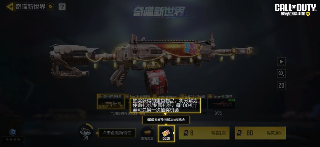 活动规则在本次【奇喵新世界】活动中,抽到重复的物品会分解为使命礼券,每100使命礼券可兑换一次抽奖机会(价值使命卡片*8)。