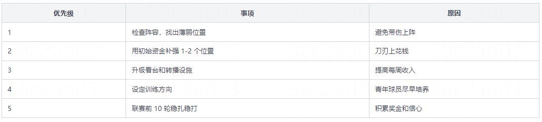 1. **收入优先升级**:看台 → 转播设施 → 荣誉室,直接提升每周进账