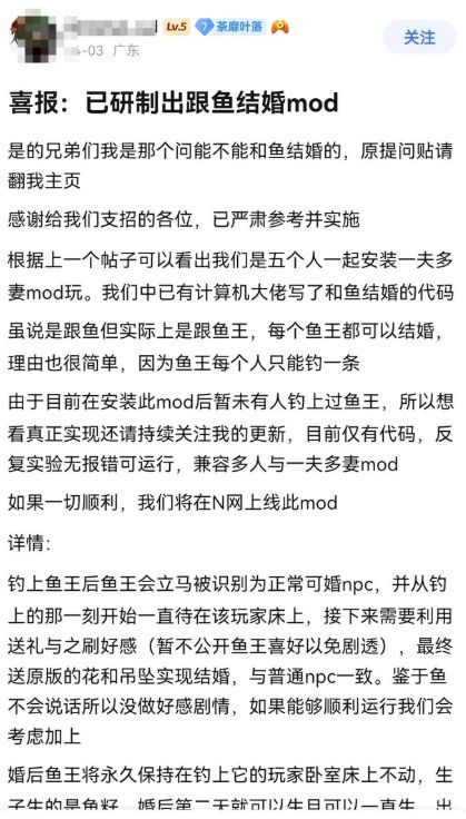 星露谷物语吧惊现神人玩家,近日有网友发帖爆料,自己已成功研制出一款颠覆常规的MOD—— 可实现与游戏中的鱼类结婚,消息一出瞬间引爆玩家社区,成为全网热议焦点。