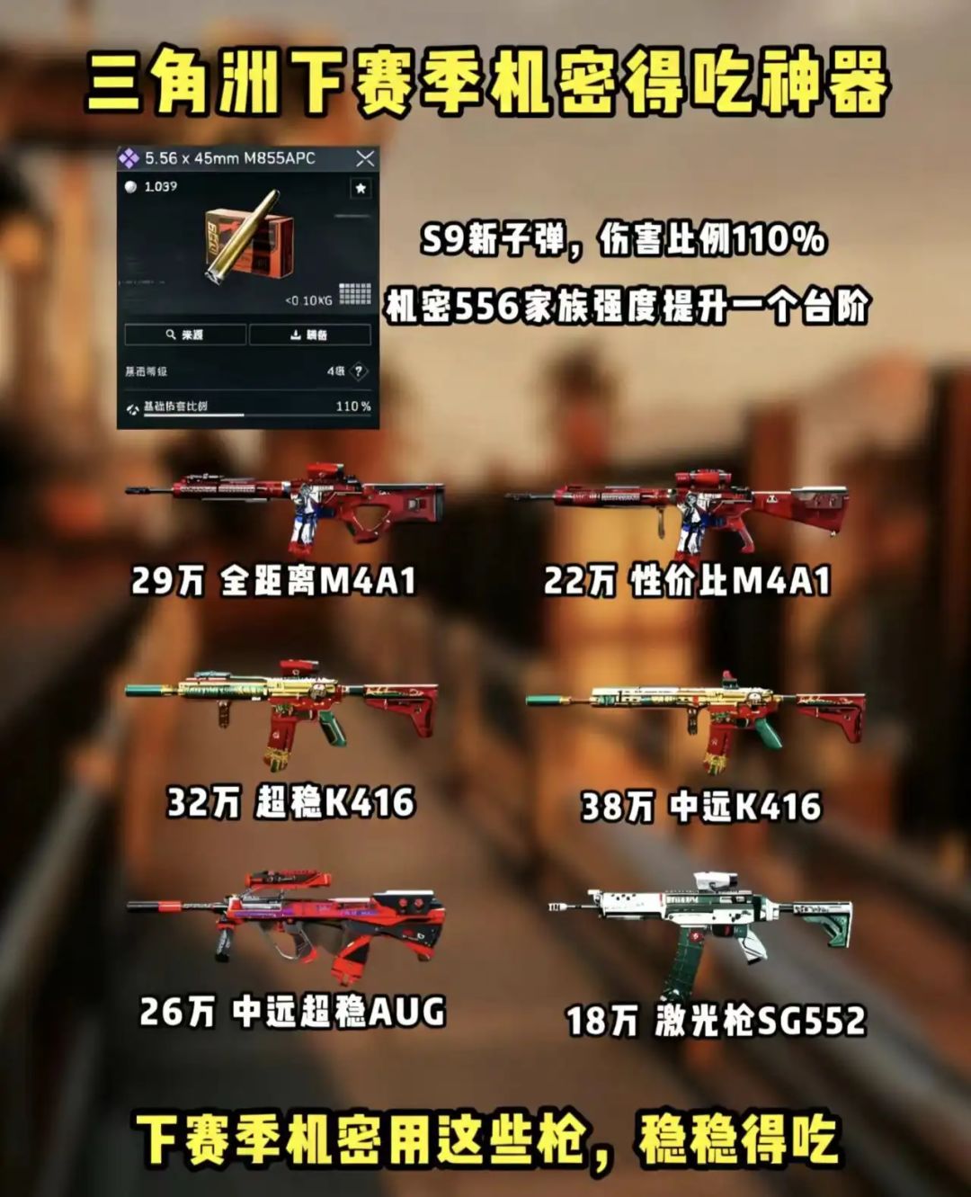 随着S9赛季的脚步越来越近,三角洲行动的机密模式即将迎来一次翻天覆地的强度洗牌,而核心变量,就是全新登场的4级5.56×45mm M855APC弹药。这款基础伤害比例高达110%的新弹种,直接给整个556枪械家族注入了前所未有的活力,让原本就强势的多款突击步枪,在机密战场的强度直接迈上了一个全新的台阶。对于所有深耕机密模式的玩家来说,这绝对是一次必须提前布局的版本机遇。新弹种带来的伤害提升,不仅拉高了556枪械的秒伤上限,更让它们在面对高护甲目标时的压制力得到了质的飞跃。无论是追求极致性价比的入门玩家,还是想要全距离制霸的硬核选手,都能在这波556家族的集体加强中,找到最适合自己的上分答案,提前备好适配的改装方案,就能在下赛季开局就抢占先机,稳稳拿下每一局机密对局的胜利。