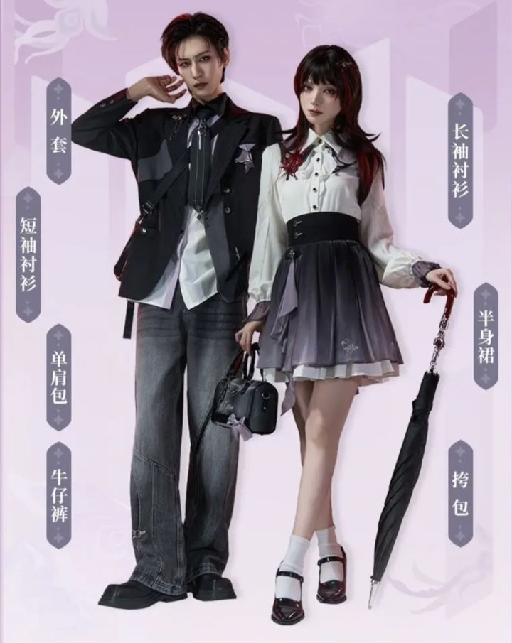 同步公布的还有“长夜月主题印象”系列服饰周边,将于4月15日20:00在官方店铺首发。产品线涵盖外套(529元)、半身裙(299元)、牛仔裤(329元)、长款衬衫(279元)、短款衬衫(299元)等单品,以及长柄伞(209元)、挎包(329元)、单肩包(299元)等配件,另有发夹胸针(89元)、手链(149元)等小配饰。整体以黑白色系为主,暗红与粉紫点缀,通过刺绣、印花融入角色元素,兼顾日常穿搭与IP辨识度。