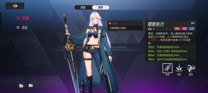 3技能3回合冷却,单段群体伤害,100的基础概率驱散两个增益,65的基础概率沉默。