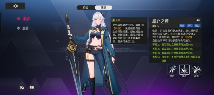2技能3回合冷却,受到群体攻击后80%的概率净化全体1个debuff(不可行动状态仍可触发),而后为全体附加1次剑魄(近乎绝对无敌)。但这个80%概率是何意味?想控制强度可以削机制,在这种关键机制处搞个不上不下的概率,不纯纯恶心玩家吗?友情提示:吉他S2加cd的优先级高于光黛纳S2(已测试过),光黛纳S2会直接进入1回合cd而不触发。