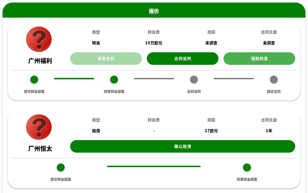 在两队进行转会谈判期间,你尚未和转会方进行合同谈判,因此你无法知道对方会开出什么谈判条件,为了做更充分的准备,你可以选择雇佣经纪人