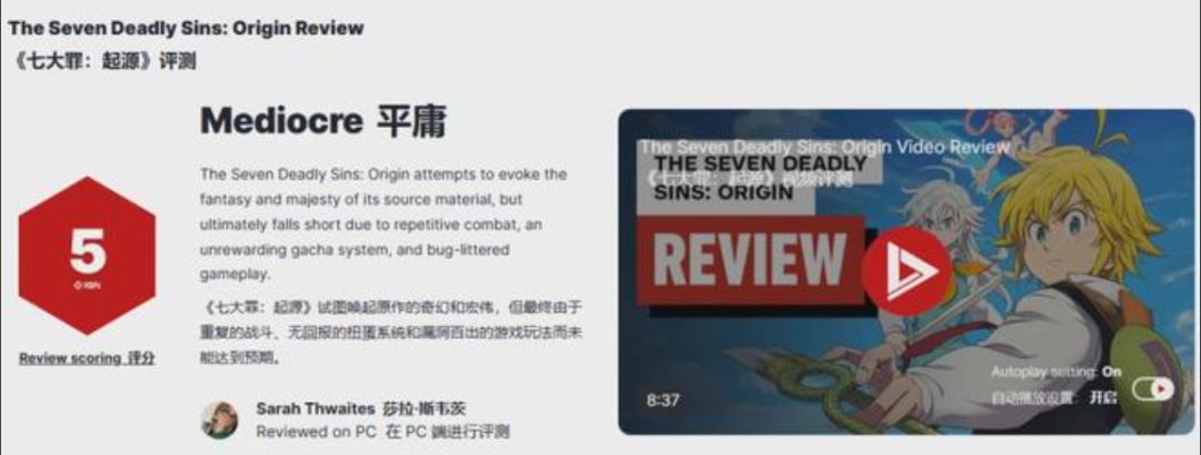 「新资讯」IGN5 分锐评!《七大罪:起源》漫改开放世界口碑崩盘
