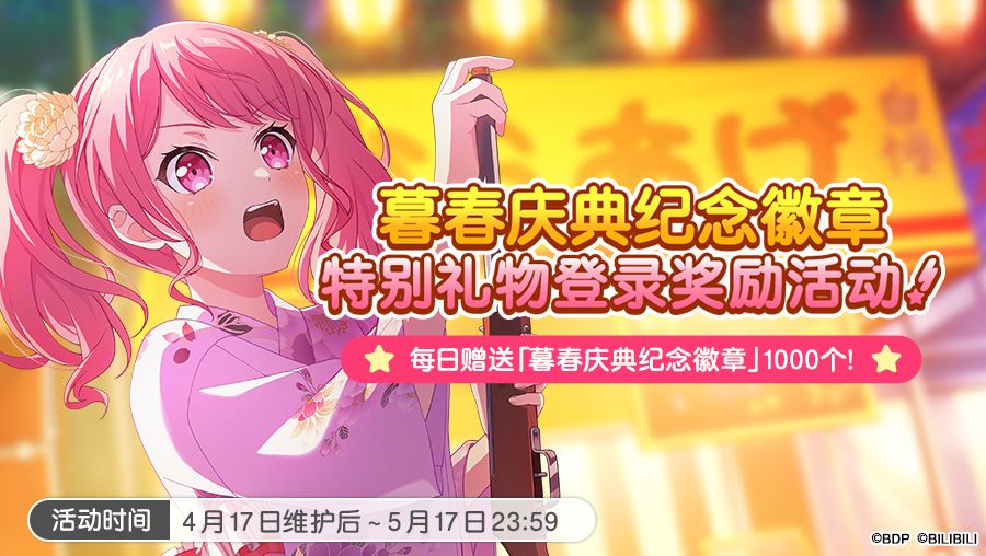 4月17日维护后~5月17日23:59期间每日登录游戏即可获得对应日期的「暮春庆典纪念徽章」。