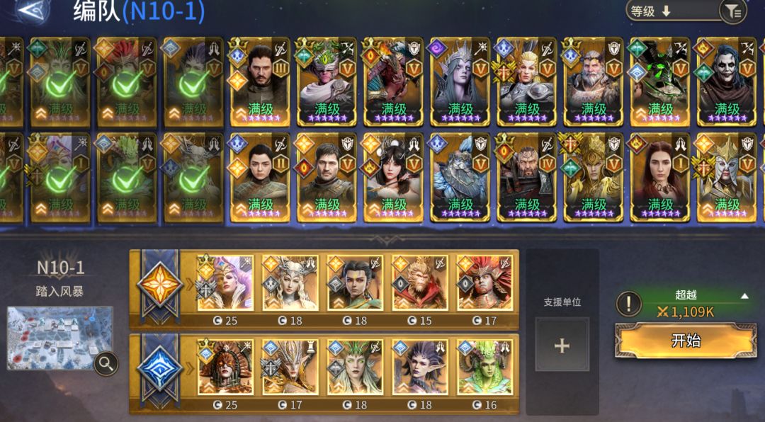 在编队页面,我们可以基于关卡设定编辑相应的队伍,在大多数场景中可构建2支阵营小队、共计10位英雄作战。