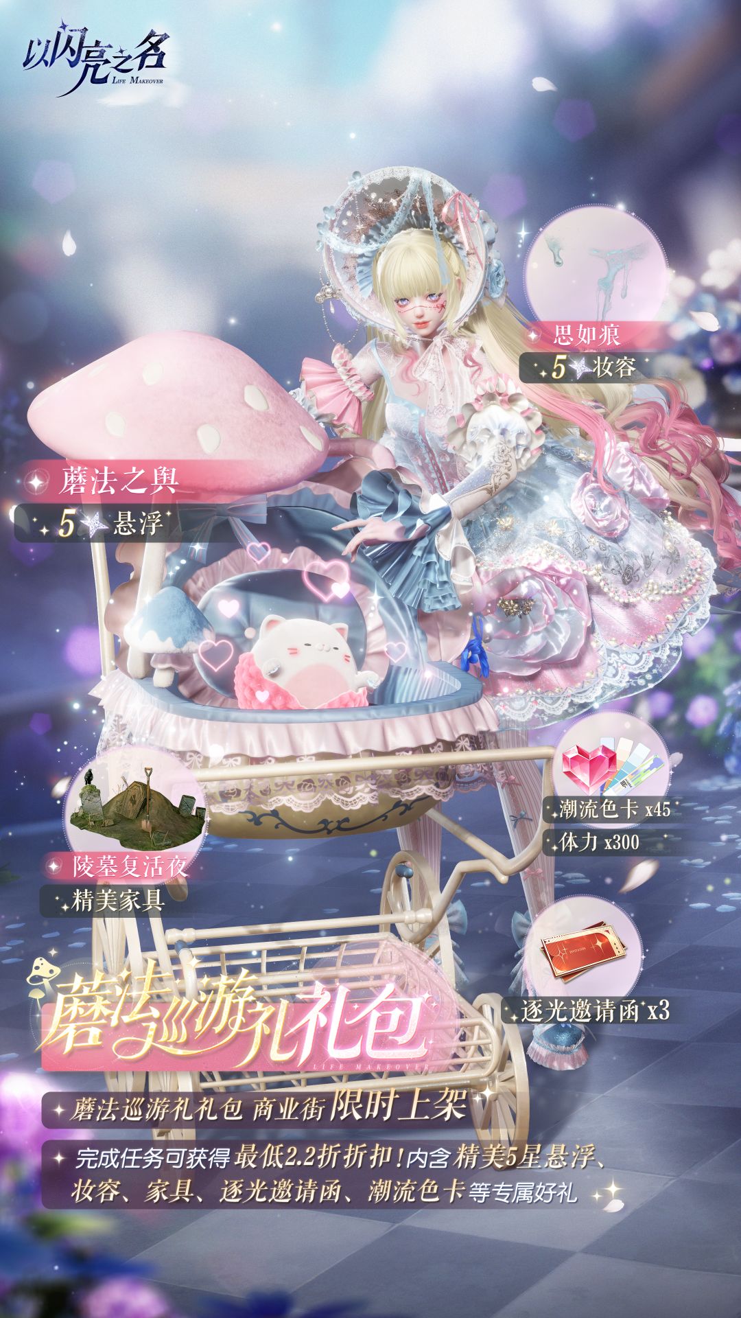 蘑法巡游礼礼包售卖期间,合伙人可以完成限定任务获取礼包折扣。完成全部4个任务可降至最低折扣2.2折!超值优惠不容错过!礼包内含五星精美悬浮【蘑法之舆】、五星妆容【思如痕】、精美家具【陵墓复活夜】、逐光邀请函*3、体力*300和潮流色卡*45,该礼包永久限购1次。
